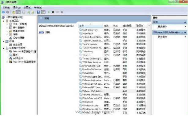 2、重啟系統(tǒng)后要是虛擬機(jī)提示:“Host USB device connections disabled”。詳細(xì)的提示如下。那么就要在Win7操作系統(tǒng)中,右鍵計(jì)算機(jī),點(diǎn)擊管理->服務(wù)和應(yīng)用程序->服務(wù),找到“VMware USB Arbitration Service”,右鍵點(diǎn)擊,啟動(dòng)即可。