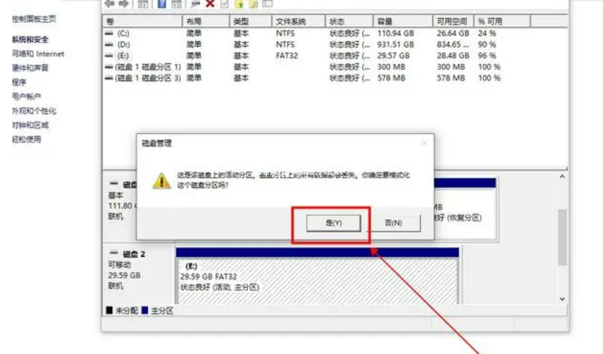 打開“控制面板”;找到“系統(tǒng)和安全”;在警告提示窗口中,點(diǎn)擊“是”即可開始格式化。