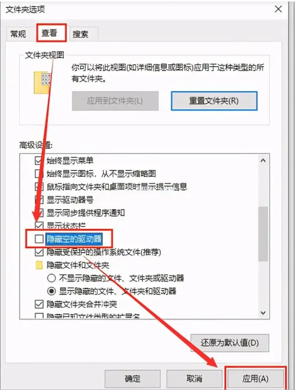 2. 在“文件夾選項(xiàng)”窗口中,選擇“查看”選項(xiàng)卡,找到“隱藏空的驅(qū)動(dòng)器”,取消勾選并點(diǎn)擊“應(yīng)用”。