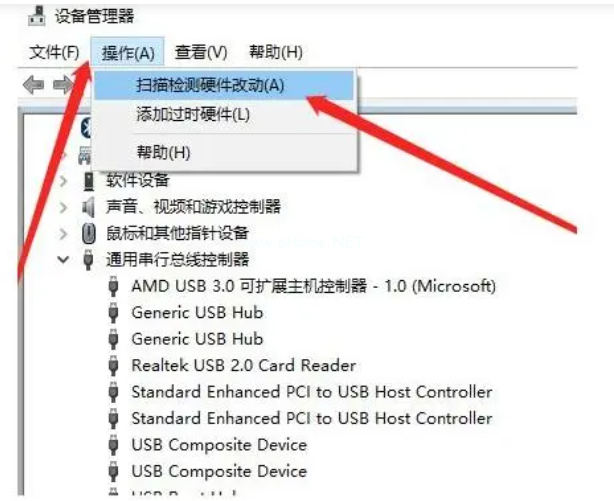 5. 點(diǎn)擊“操作”菜單,選擇“掃描檢測(cè)硬件改動(dòng)”。