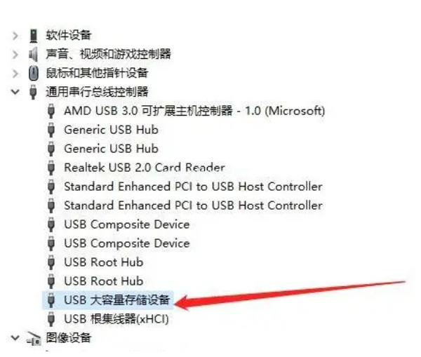 3. 在“設(shè)備管理器”窗口中,展開“通用串行總線控制器”,找到“USB大容量存儲(chǔ)設(shè)備”。