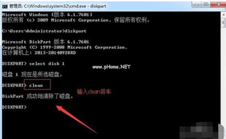4、輸入“clean”命令,清除U盤上的所有數(shù)據(jù)。