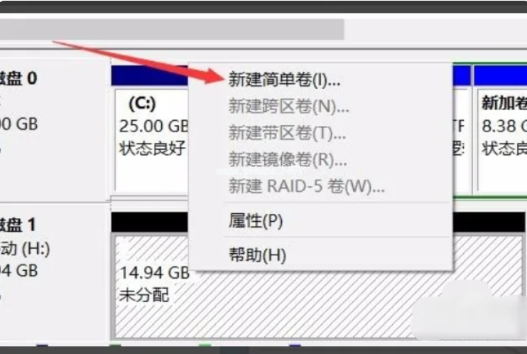 4、右鍵點(diǎn)擊該未分配空間,選擇“新建簡單卷”。