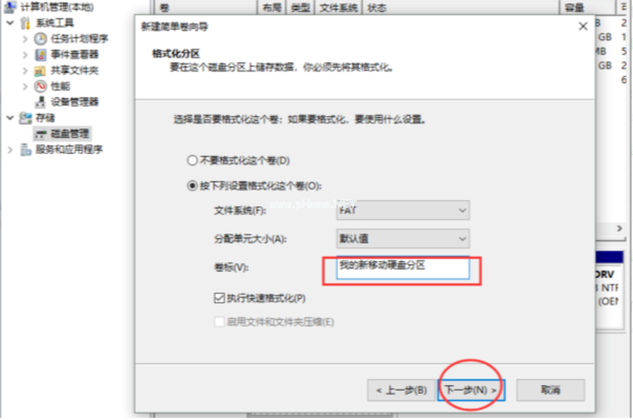 7、為新磁盤分區(qū)起個名字,如“我的新U盤分區(qū)”。
