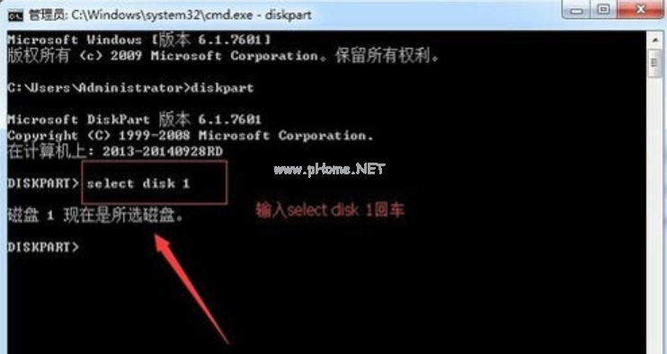 3、輸入“select disk”加上U盤對應(yīng)的數(shù)字,例如“select disk 1”(注意:數(shù)字根據(jù)實(shí)際情況更改)。