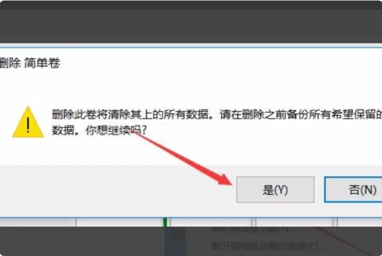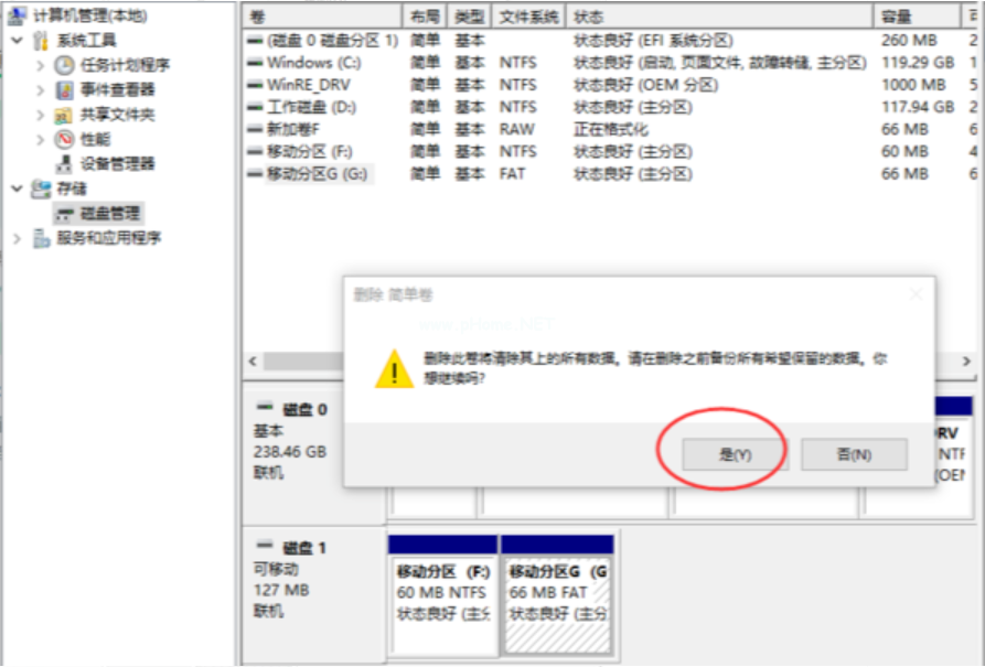 2、點(diǎn)擊“是”進(jìn)行確認(rèn)刪除,進(jìn)入刪除卷過程,看到磁盤分區(qū)變成了未分配空間。