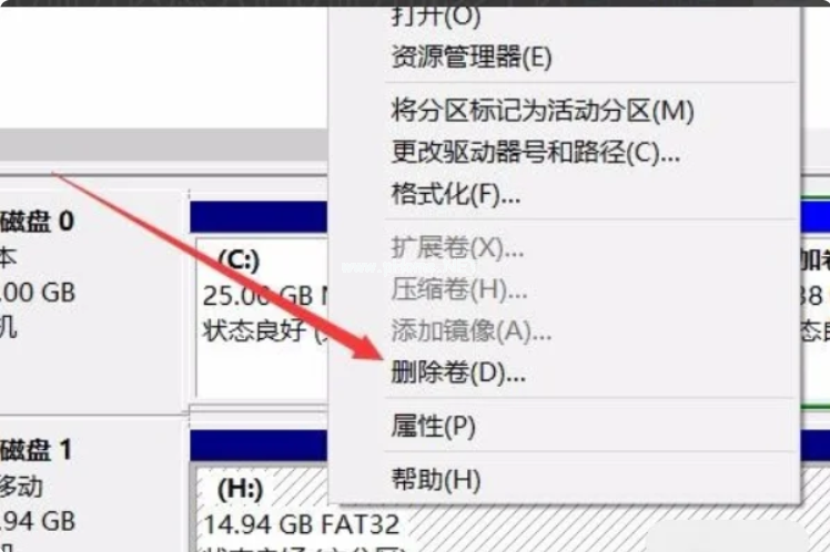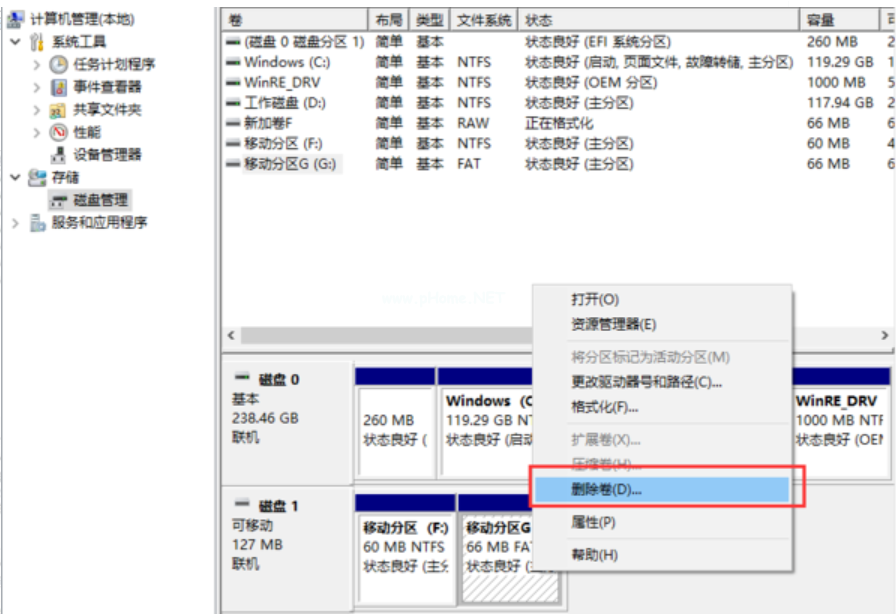 1、連接U盤后,在計算機(jī)磁盤管理中找到需要合并的U盤分區(qū),右鍵點(diǎn)擊某一個分區(qū),選擇“刪除卷”。