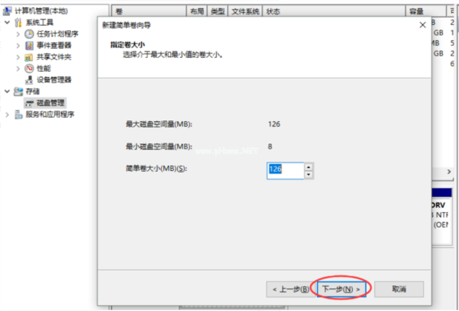 5、系統(tǒng)調(diào)用新建簡單卷向?qū)?,按照提示操作,維護(hù)新卷大小為整個未分配空間。