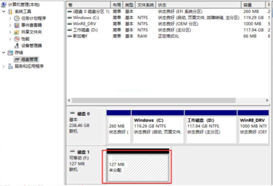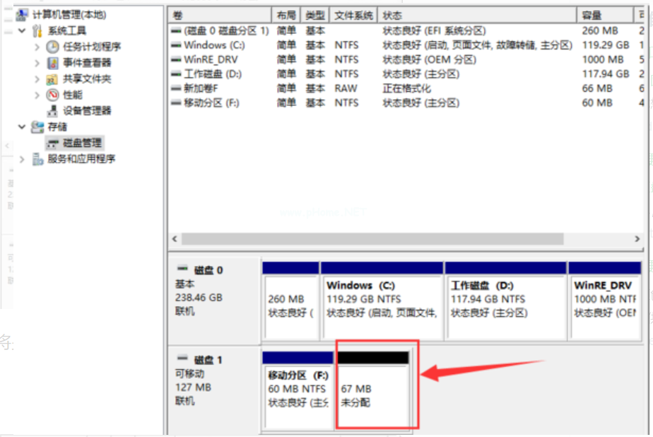 5、在計算機(jī)管理中找到未分配的可移動硬盤,對U盤進(jìn)行磁盤分區(qū)。