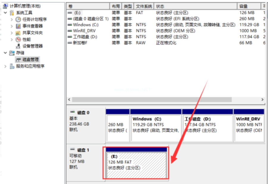 8、確認(rèn)完成新建簡單卷的流程,等待格式化完成后,再次回到磁盤管理,就可以看到新的U盤分區(qū)。