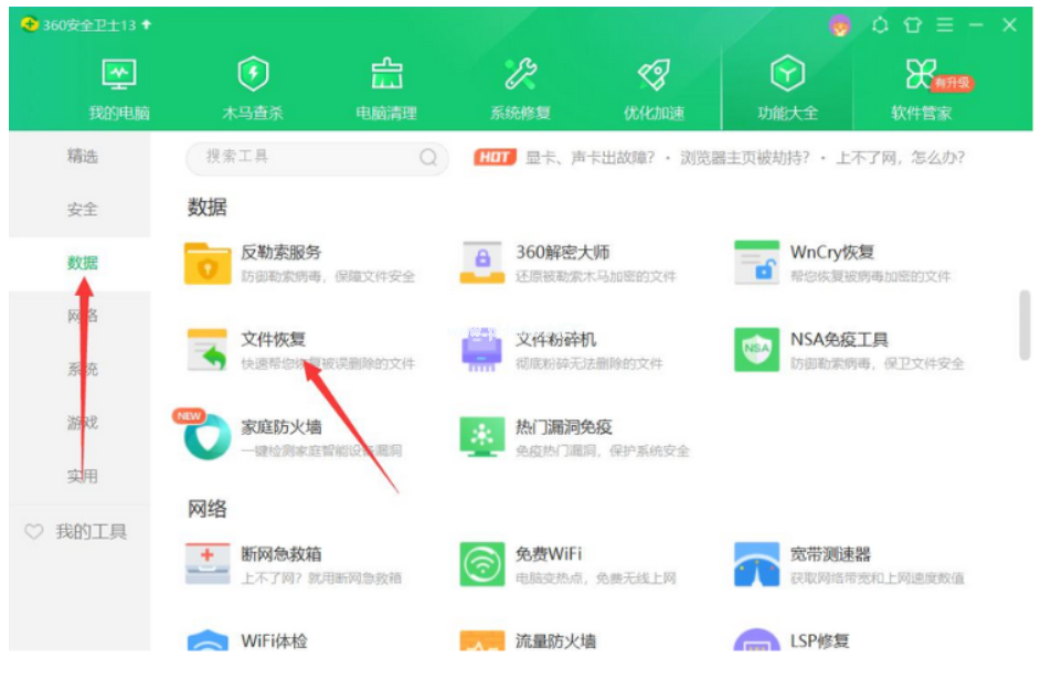 2、點(diǎn)擊左側(cè)的“數(shù)據(jù)”,選擇“文件恢復(fù)”添加,即可下載安裝好360u盤(pán)文件恢復(fù)工具。