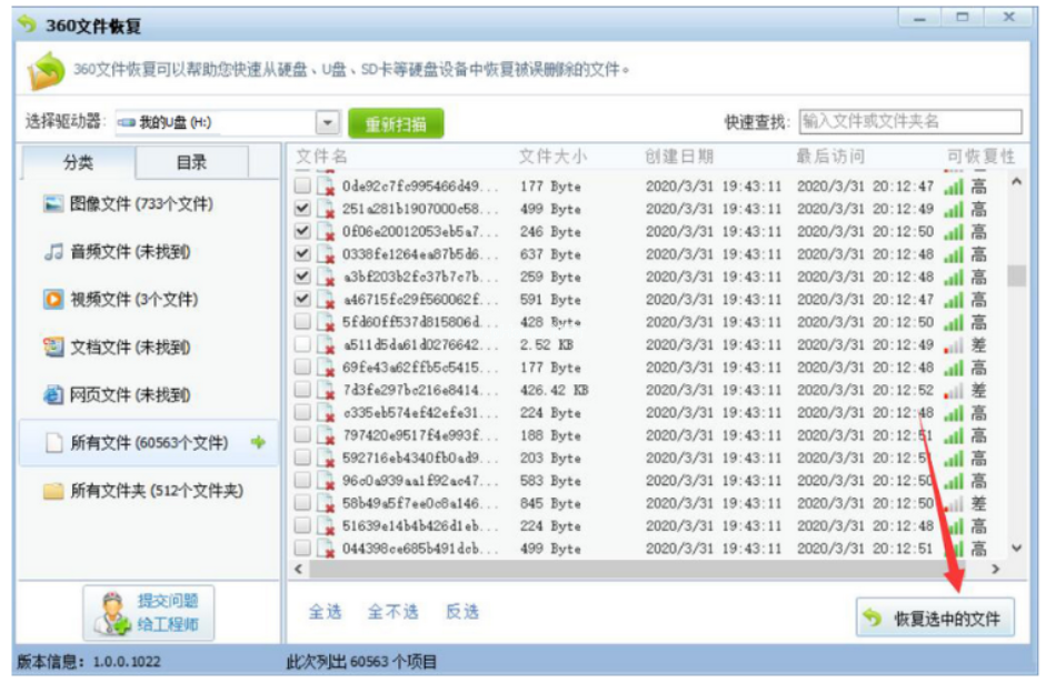 4、掃描完成后,選擇需要恢復(fù)的文件,點(diǎn)擊“恢復(fù)選中的文件”。