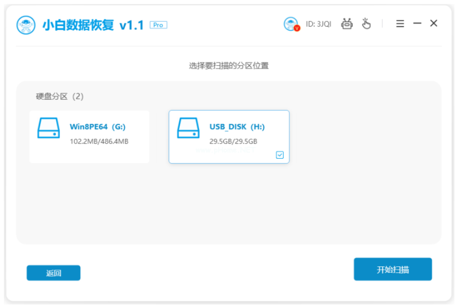 2、選擇誤刪文件所在的u盤(pán)分區(qū),單擊“開(kāi)始掃描”。