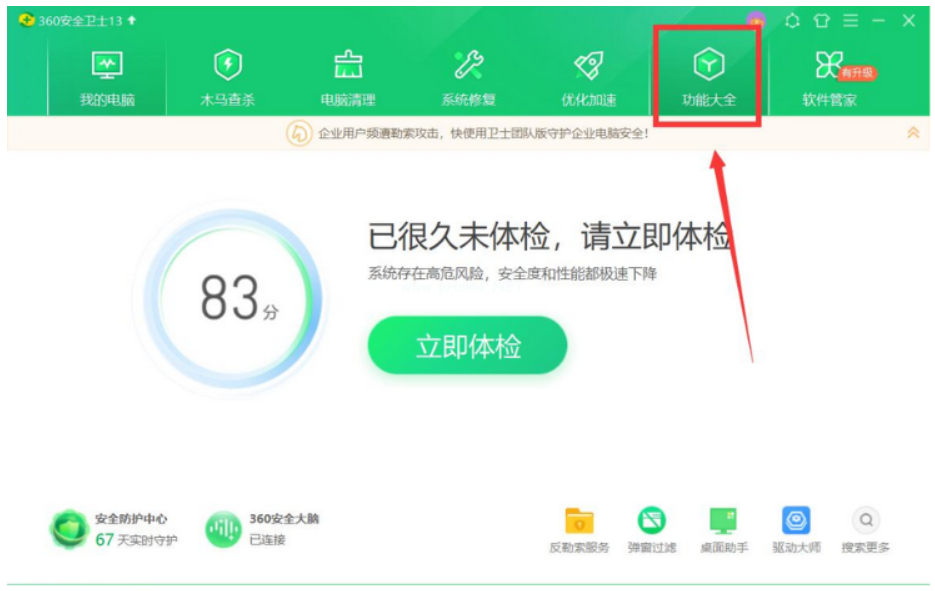 1、首先將u盤(pán)插入電腦中,打開(kāi)360安全衛(wèi)士后,點(diǎn)擊上方的“功能大全”。