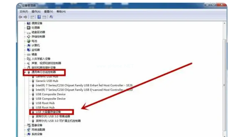3、進(jìn)入設(shè)備管理器中,在通用串行總線控制器中選擇“USB大容量存儲(chǔ)設(shè)備”;