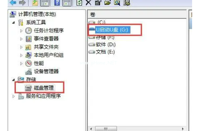 ,點(diǎn)擊“存儲(chǔ)”,選擇“磁盤管理”選項(xiàng);點(diǎn)擊無法正常顯示的U盤,選擇“更改驅(qū)動(dòng)器和路徑”;