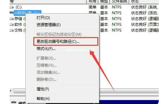 3、接著右鍵點(diǎn)擊無法正常顯示的U盤,選擇“更改驅(qū)動(dòng)器和路徑”;