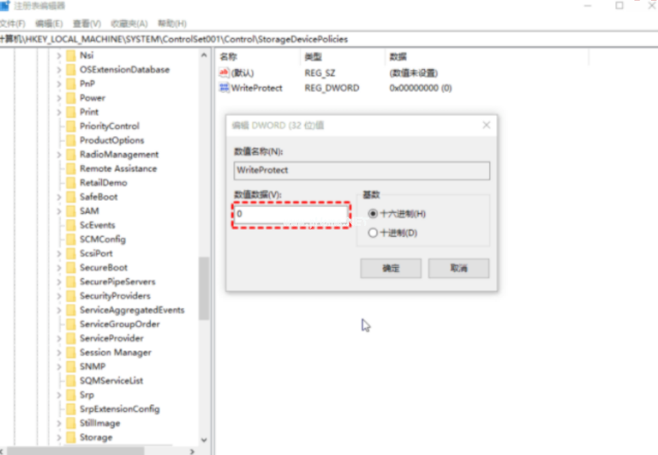 在右側(cè)窗格上,雙擊WriteProtect或右鍵單擊它,然后選擇修改。在彈出窗口中,你可能會(huì)發(fā)現(xiàn)數(shù)值數(shù)據(jù)設(shè)置為1,這表示當(dāng)前計(jì)算機(jī)已啟用USB存儲(chǔ)設(shè)備上的寫保護(hù)。要禁用它,你需要將值從1更改為0,然后單擊確定以應(yīng)用更改。