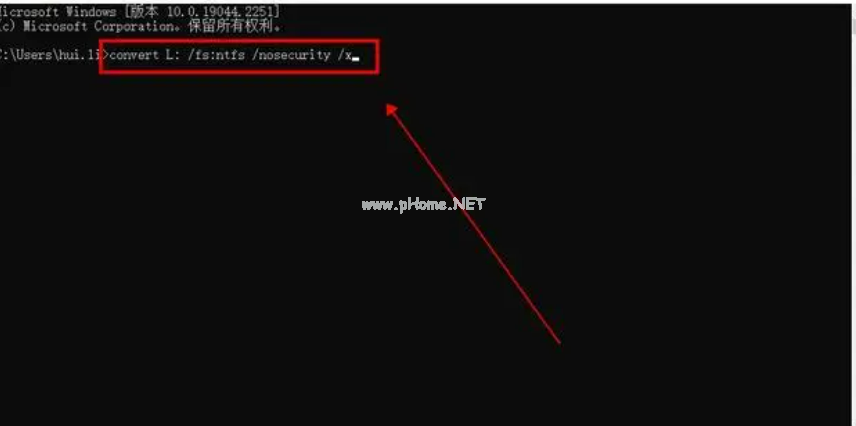 2、在彈出的窗口輸入“convert L: /fs:ntfs /nosecurity /x”,確定運行即可。