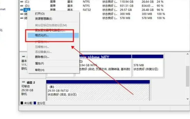 4、在彈出磁盤管理窗口中,,右鍵U盤所在的磁盤,點擊“格式化”;