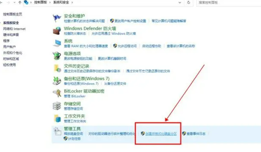 將U盤插入電腦,打開“控制面板”;選擇“系統(tǒng)和安全”;點擊管理工具下的“創(chuàng)建并格式化硬盤分區(qū)”選項;
