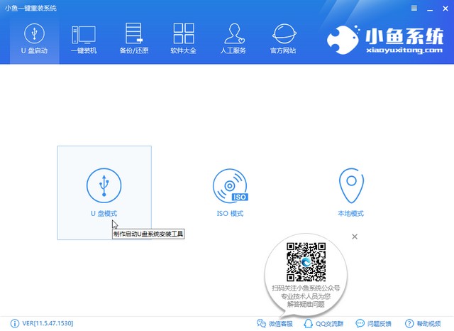 1、打開小魚一鍵重裝系統(tǒng)軟件會出現(xiàn)如圖界面,切換至U盤啟動界面,選擇U盤模式。小魚系統(tǒng)還提供免費的人工客服,有問題可以隨時咨詢。