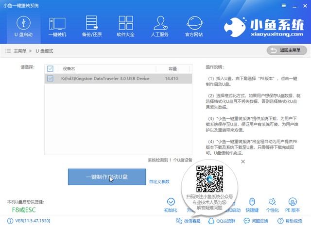 1、找一臺可以正常上網(wǎng)的電腦下載小魚一鍵重裝系統(tǒng)軟件,它可以將普通U盤一鍵制作為啟動U盤哦。下載地址:https://www.xiaoyuxitong.com/