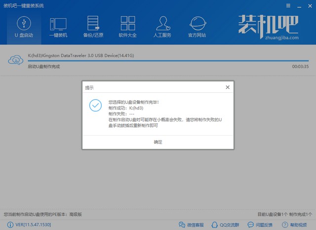 3、選擇U盤復(fù)選框,點(diǎn)擊一鍵制作啟動(dòng)U盤。裝機(jī)吧提供人工技術(shù)客服,有問題可以隨時(shí)聯(lián)系。