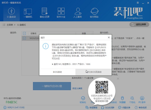 3、雙擊打開裝機(jī)吧一鍵重裝系統(tǒng)軟件,然后選擇U盤啟動(dòng)>>U盤模式。