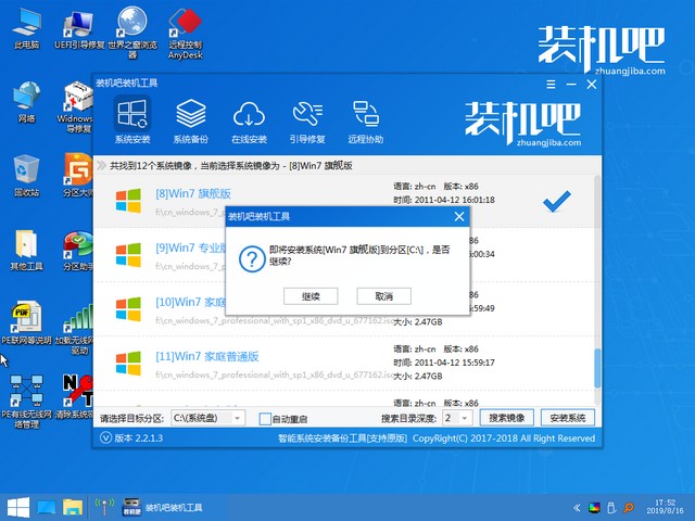 10、來到裝機吧PE系統(tǒng)界面,自動出現(xiàn)的裝機工具中選擇之前下載的XP系統(tǒng),左下角目標分區(qū)設置為C盤,然后點擊右下角的安裝系統(tǒng),出現(xiàn)提示中點擊繼續(xù)。