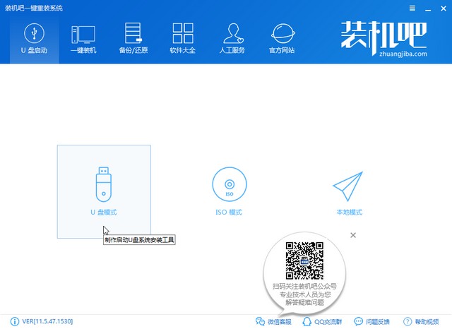 2、之后將一個大于8G的U盤插入此電腦,雙擊打開裝機吧,進入功能界面后,選擇菜單上方的U盤啟動選項,選擇U盤模式。