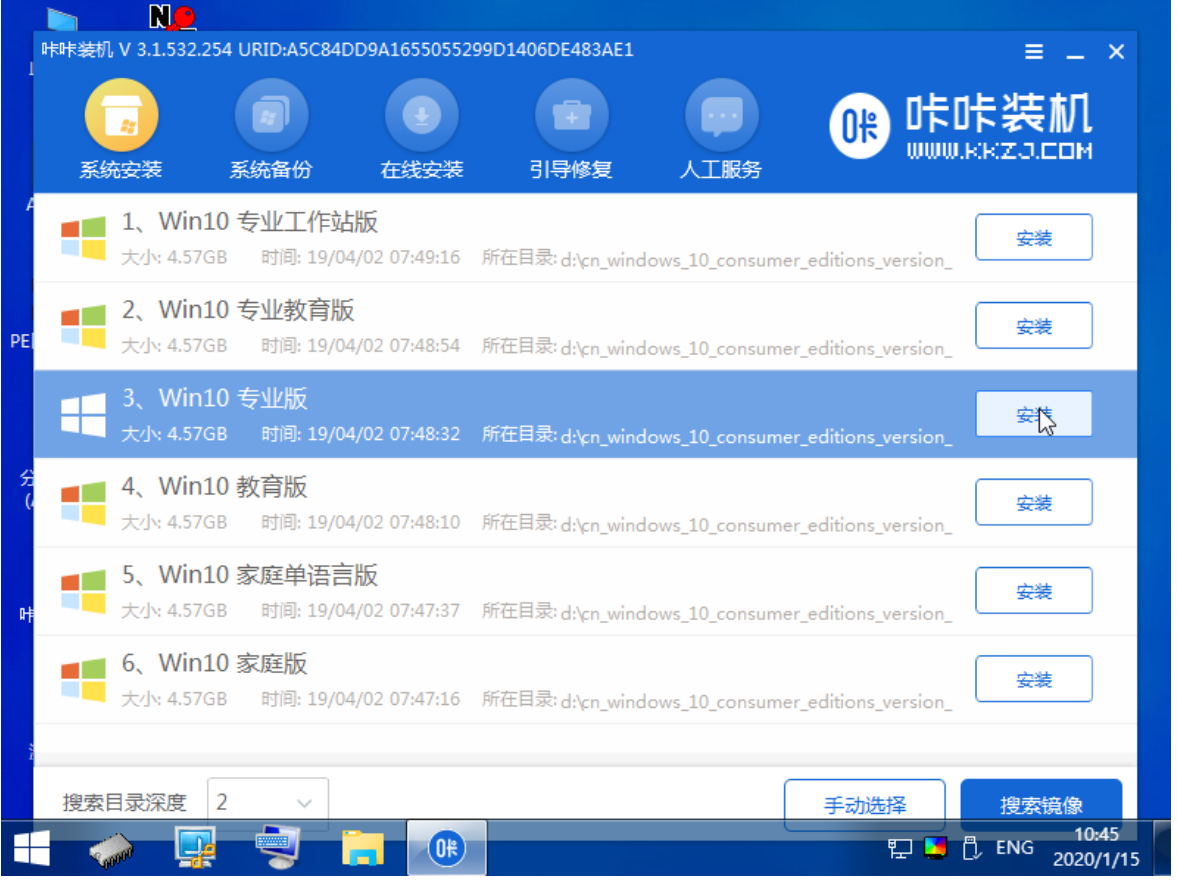 5、在pe系統(tǒng)桌面上打開咔咔裝機(jī)工具,然后選擇win10系統(tǒng)點(diǎn)擊安裝。