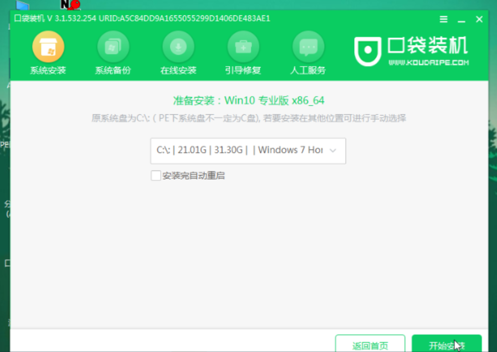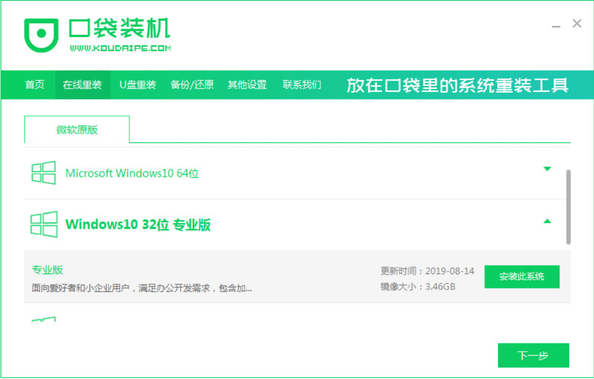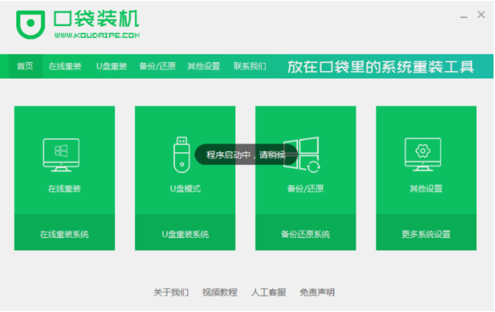 1、首先我們打開【口袋裝機】工具,進入到首頁當中,選擇u盤重裝系統(tǒng)功能。