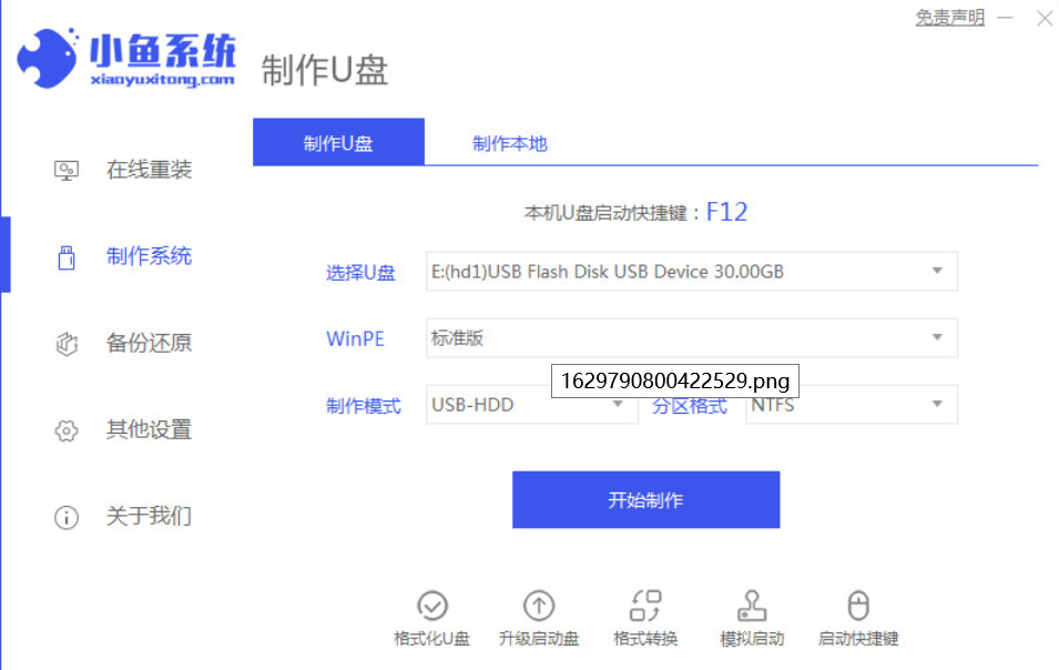 2、然后將我們的U盤插入計算機(jī)中,這時單擊開始制作。
