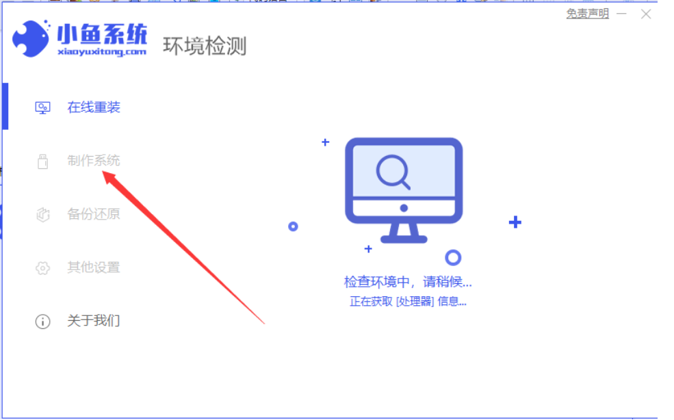 1、首先關(guān)閉計算機(jī)上運(yùn)行的殺毒軟件,然后打開小魚一鍵重裝系統(tǒng),然后選擇制作系統(tǒng)里面的[U盤模式]。
