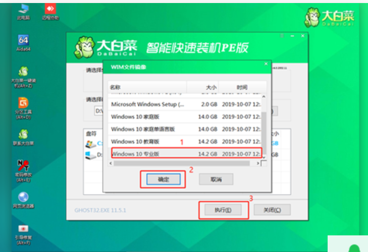 4、選擇U盤里面準備的ISO鏡像文件安裝,參考下圖:選擇windows10專業(yè)版點擊“確定”,再點擊“執(zhí)行”在大白菜一鍵還原窗口。