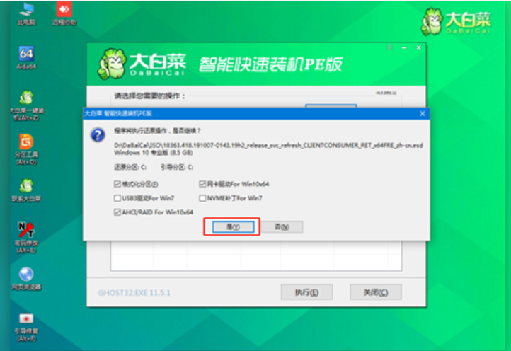 4、選擇U盤里面準備的ISO鏡像文件安裝,點擊“確定”,點擊“執(zhí)行”在大白菜一鍵還原窗口。