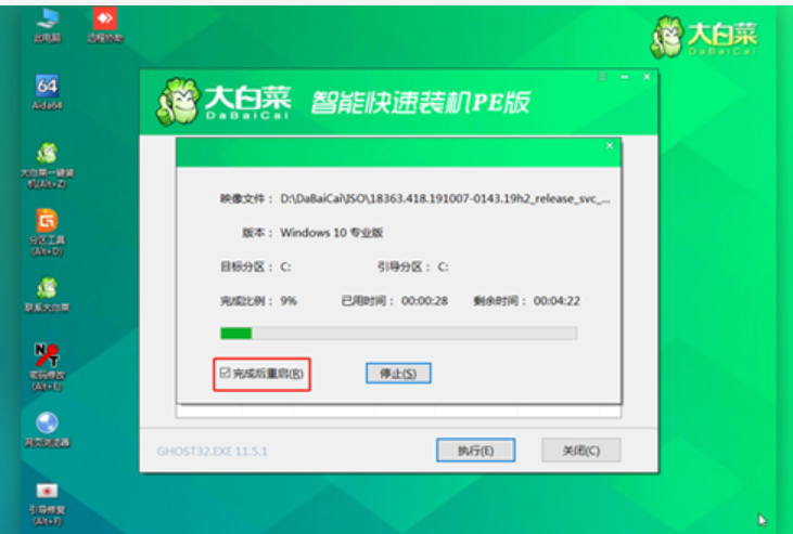 6、程序?qū)懭氪惭b完畢后點擊 “是” 重啟筆記本,同時要拔掉U盤以免再次進入大白菜winpe界面了。