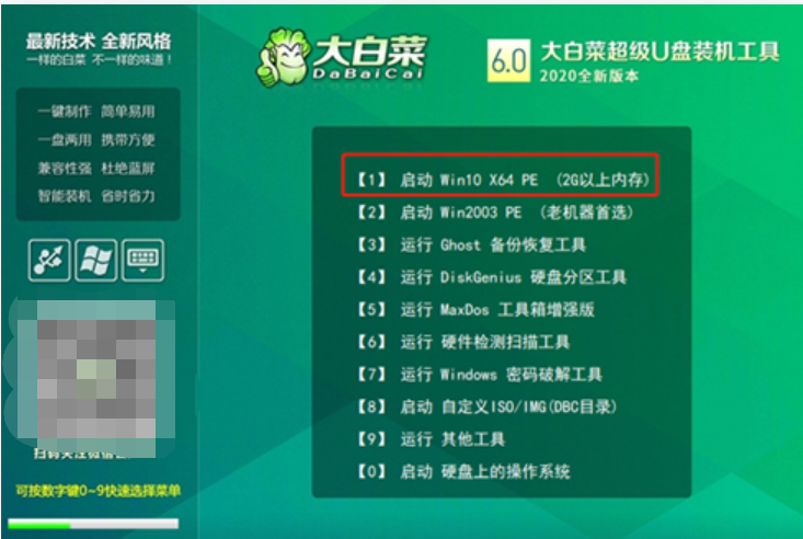3、進入大白菜winpe界面后,選擇“【1】啟動Win10 X64PE(2G以上內(nèi)存)”。