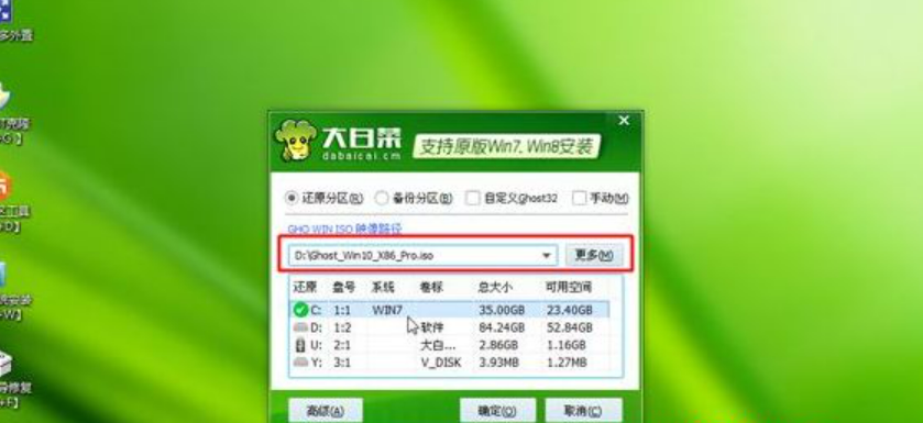 4、雙擊打開(kāi)【大白菜一鍵裝機(jī)】,選擇win10 iso鏡像。會(huì)自動(dòng)提取gho文件,點(diǎn)擊下拉框,選擇win10.gho文件;