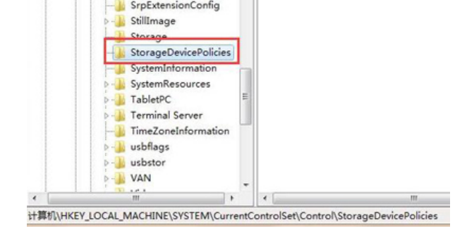 2、然后依次打開(kāi):“HKEY_LOCAL_MACHINE\SYSTEM\CurrentControlSet\Control”,在control下創(chuàng)建新項(xiàng),命名為 “StorageDevicePolicies”如圖所示: