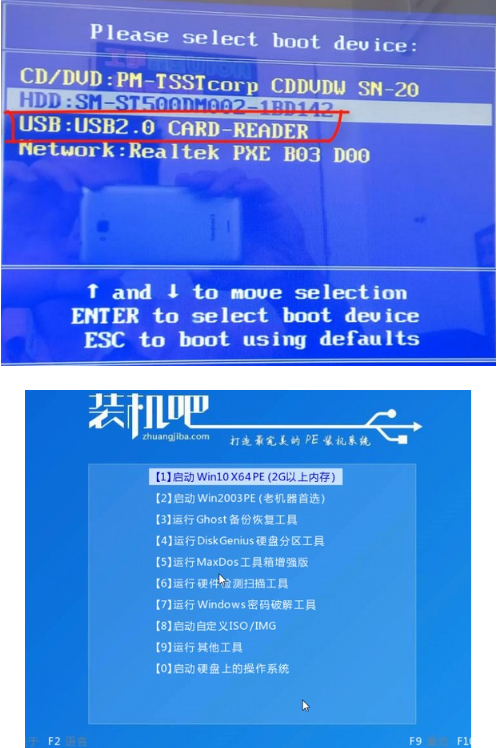 3、把u盤(pán)插入我們需要重裝系統(tǒng)的電腦,開(kāi)機(jī)不斷按熱鍵進(jìn)入界面選擇u盤(pán)啟動(dòng),選擇進(jìn)入pe系統(tǒng)。