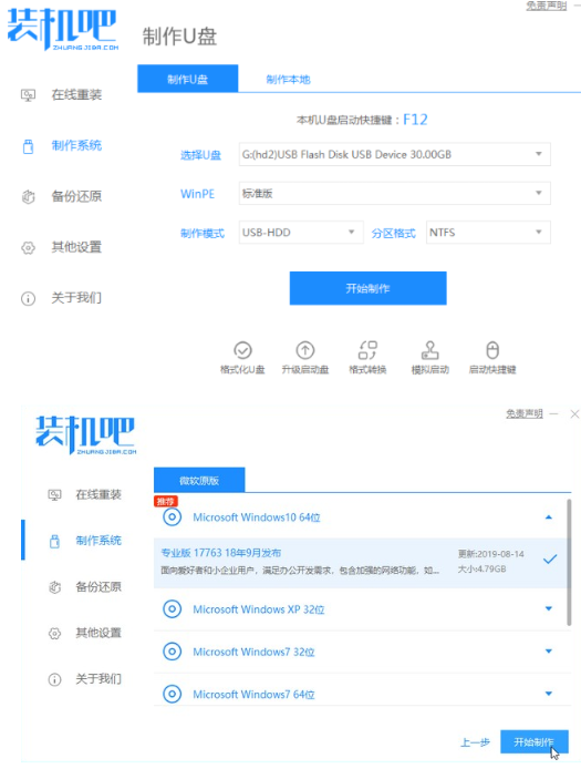 1、準(zhǔn)備一個(gè)8g以上的u盤(pán)。下載并打開(kāi)裝機(jī)吧軟件,點(diǎn)擊制作系統(tǒng),選擇我們想要的系統(tǒng)開(kāi)始制作。