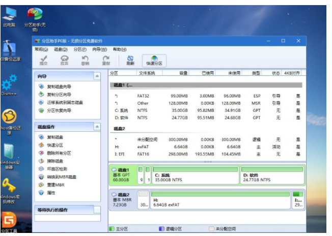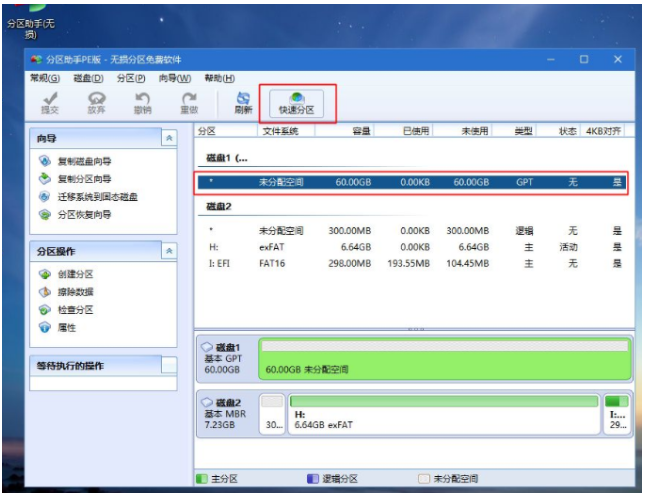 4、進(jìn)入到pe之后,要在uefi下安裝win10系統(tǒng),硬盤需要GPT分區(qū)表,如果之前已經(jīng)是預(yù)裝win10機(jī)型,直接執(zhí)行第7步;如果需要全盤重新分區(qū),則雙擊桌面上的【分區(qū)助手(無損)】,選擇磁盤1,點(diǎn)擊【快速分區(qū)】,如果你是多個(gè)硬盤,要選對(duì),不要誤刪;