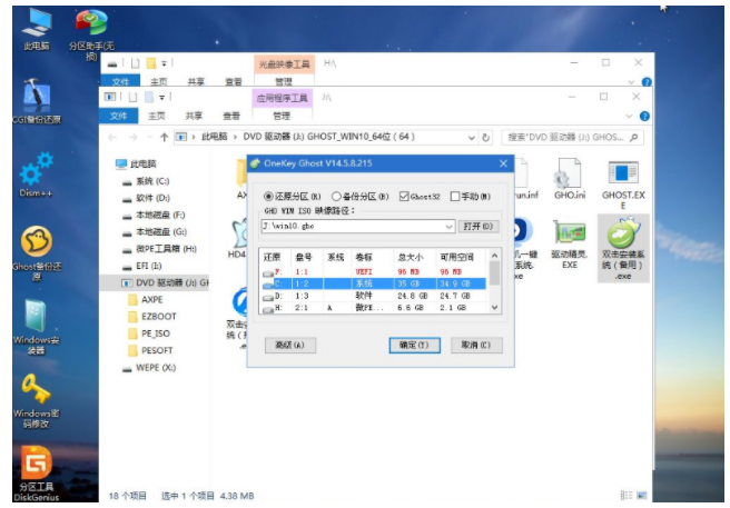 8、雙擊【雙擊安裝系統(tǒng).exe】,運(yùn)行安裝工具,選擇【還原分區(qū)】,GHO WIM ISO映像路徑會(huì)自動(dòng)提取到win10.gho,接著選擇安裝位置,一般是C盤,或者根據(jù)卷標(biāo)或總大小來判斷,選擇之后,點(diǎn)擊確定;