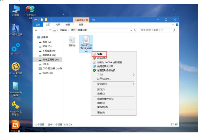 7、接著打開此電腦—微PE工具箱,右鍵win10系統(tǒng)iso鏡像,選擇【裝載】,如果沒有裝載,右鍵—打開方式—資源管理器;