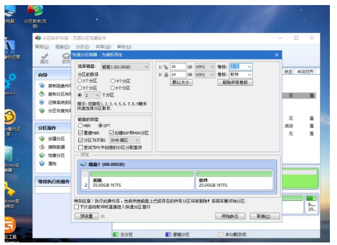 5、設(shè)置分區(qū)數(shù)目、分區(qū)大小以及分區(qū)類型,卷標(biāo)為【系統(tǒng)】的系統(tǒng)盤建議50G以上,由于選擇了UEFI啟動(dòng),磁盤類型要選擇GPT,【分區(qū)對(duì)齊到】是4k對(duì)齊,2048扇區(qū)就行,也可以4096扇區(qū),確認(rèn)無誤后點(diǎn)擊開始執(zhí)行;