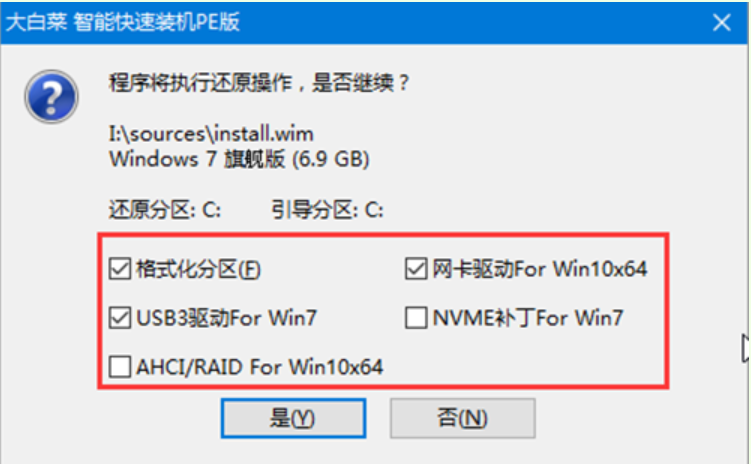4、稍后彈出還原設(shè)置窗口,建議勾選“網(wǎng)卡驅(qū)動”以及“USB驅(qū)動”復(fù)選框,點(diǎn)擊“是”進(jìn)入下一步。