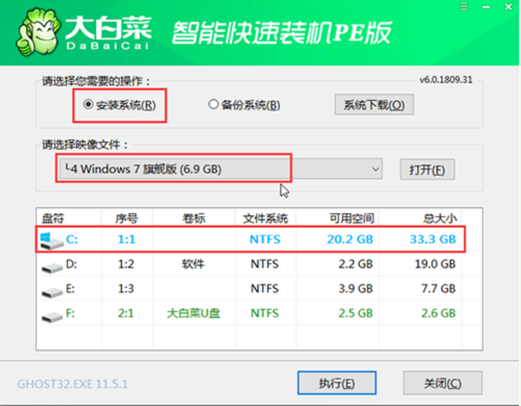 3、在桌面上找到并打開大白菜一鍵重裝,進(jìn)入重裝界面后,選擇“安裝系統(tǒng)”,選擇已下載的win7鏡像系統(tǒng)作為“映像文件”,勾選安裝路徑為“C盤”,最后點(diǎn)擊“執(zhí)行”。