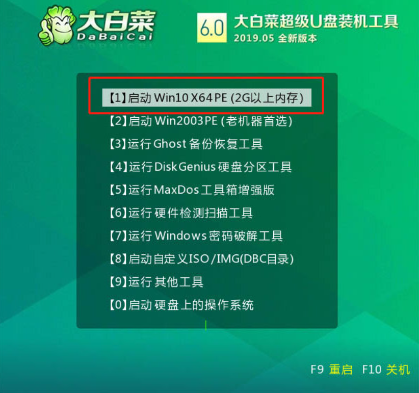 2、選擇【1】Win10X64PE(2G以上內(nèi)存),回車進(jìn)入大白菜PE桌面。